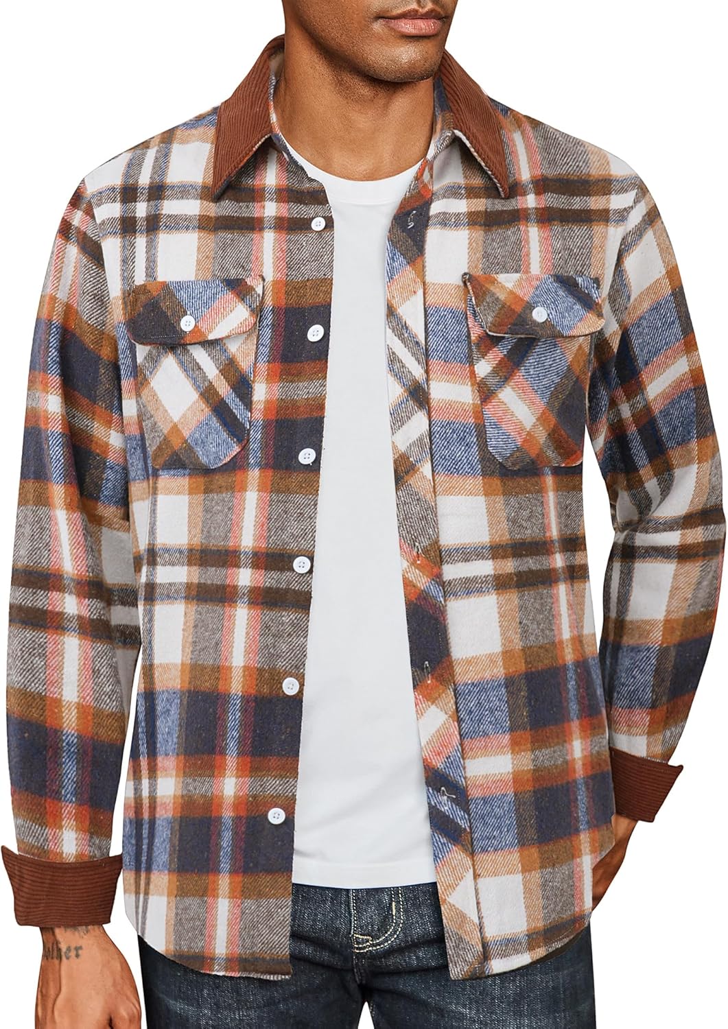 - CLASSIC PLAID DEISGN: Flannel shirt jacket features classic plaid elements with adding unique contrasting detailing on the corduroy collar and cuffs. It has dual functional check pockets for carrying small items and a double-pleated back for ease of movement, as well as a curved hem, all of which add a dash of creativity to your classic plaid look.